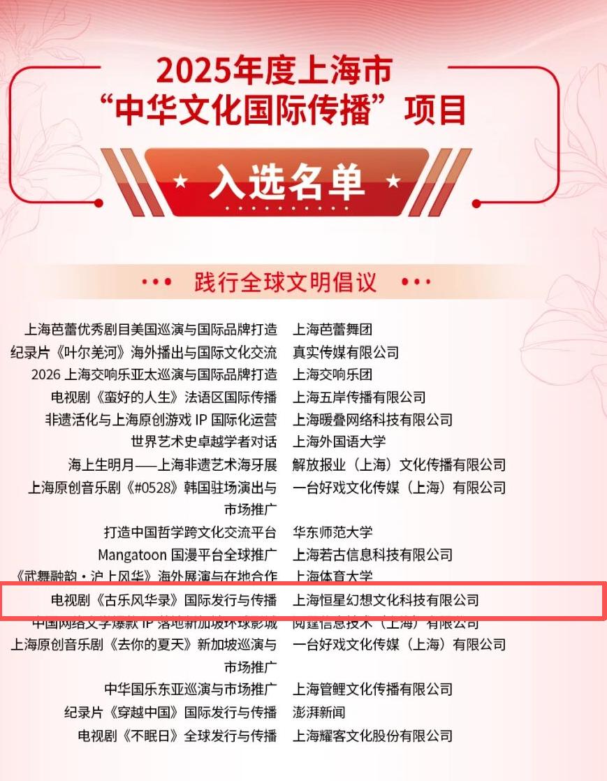 华体会体育平台是一家专注于体育娱乐的领先平台。华体会专注体育竞技,华体会app提供实时体育赛事、华体会棋牌、华体会彩票、华体会百家乐、华体会APP,华体会官网,华体会官方网站,华体会网址,华体会登陆链接,华体会平台,华体会官方平台,华体会app下载,华体会体育靠谱吗,华体会2025最新,华体会世界杯,华体会体育打造安全便捷的互动娱乐平台,体验最好的赛事服务。近日,2025年度上海市“中华文化国际传播”“银鸽之光”第二十届上海市国际传播优秀项目征集活动结果正式揭晓。本次征集活动聚焦践行全球文明倡议、上海形象世界推广、全球叙事能力建设、推动中外民心相通四大方向,吸引全市各方分别选送263个项目、1500余个项目积极申报。 普陀区两家文化企业项目从众多参评项目中脱颖而出,上海恒星幻想文化科技有限公司的“电视剧《古乐风华录》国际发行与传播”入选“中华文化国际传播”项目,华东师范大学出版社有限公司的“《百年科学往事——杨振宁访谈录》英文版”入选“银鸽之光”国际传播产品(最佳出版)奖。
